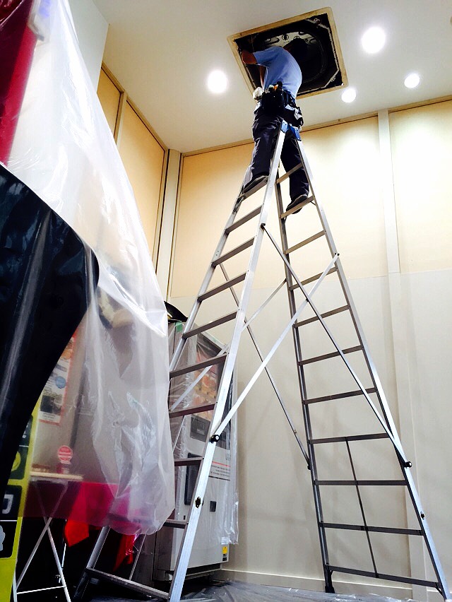 清掃中~! 2015/07/21 以前天井の高い所で5mはあるとお話しましたが~ 写真をご覧いただければ、高ーいと分かりますでしょうか? 高所恐怖症の私は、見てるだけで充分ですが(笑) エアコン清掃と言うと家庭用を想像しますが、イー・リフレスではこの様な業務用もたくさん熟しております。 業務用エアコンの清掃希望の方、是非当社にお任せください。 もちろん家庭用でも~